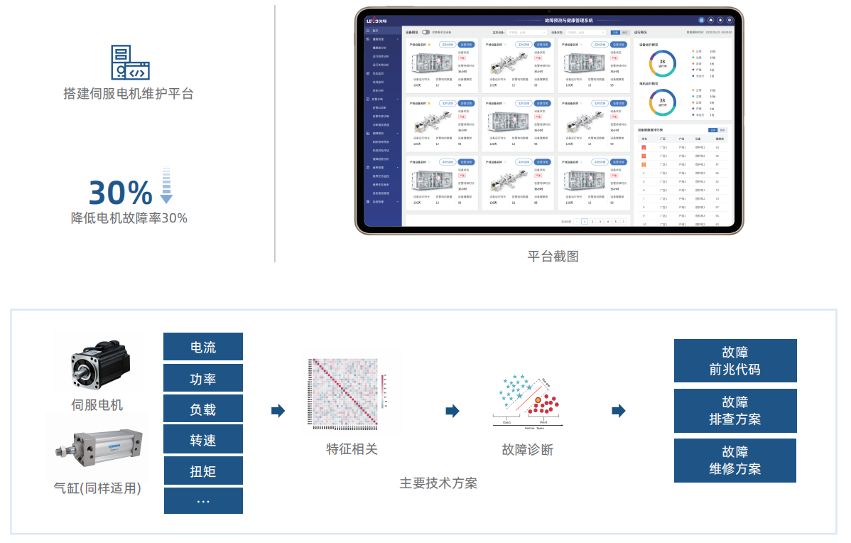 解决方案:搭建伺服电机预测维护平台,用户可以自定义添加电机的型号、运动模式等信息,平台中内置运动模板会解析电机的实时动作数据,通过AI算法自主提取出健康基准和动态阈值模型,当电机出现故障前兆时及时预警,避免故障停机。